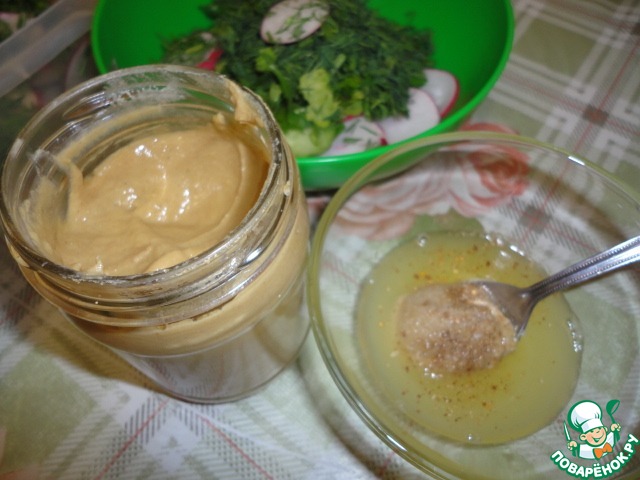 Готовим соус. Смешать горчицу, оливковое масло, лимонный сок, сахар, чеснок (через пресс).