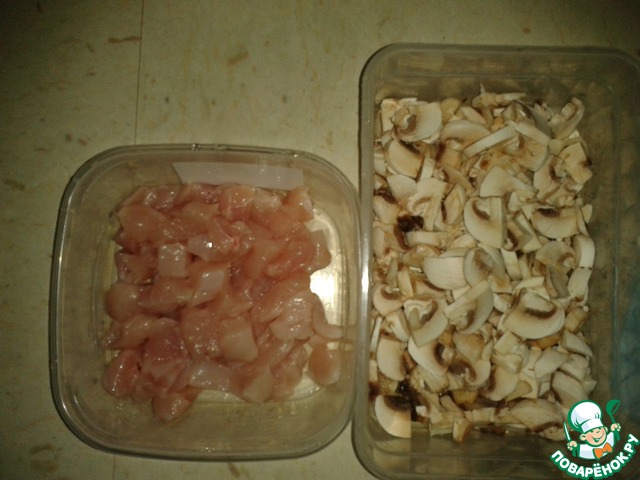 Нарезаем филе и шампиньоны на небольшие кусочки. Грибы предварительно помыть и почистить.