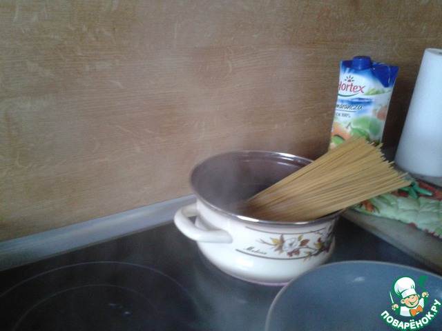 Ставим воду для спагетти, как закипит кладем варить. Спагетти должны быть аль-денте, главное не переварить.