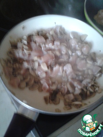 К грибам добавляем курочку, слегка поджариваем её что бы она побелела сверху.
