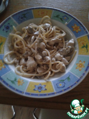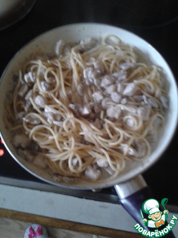 К тому времени у нас готовы спагетти, выкладываем их на сковородку и хорошо перемешиваем с соусом и остальным. Оставляем при закрытой крышке минут на 3-5 на маленьком огне, чтоб дошли спагетти и пропитались всем.