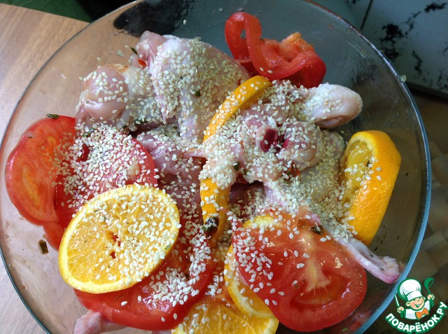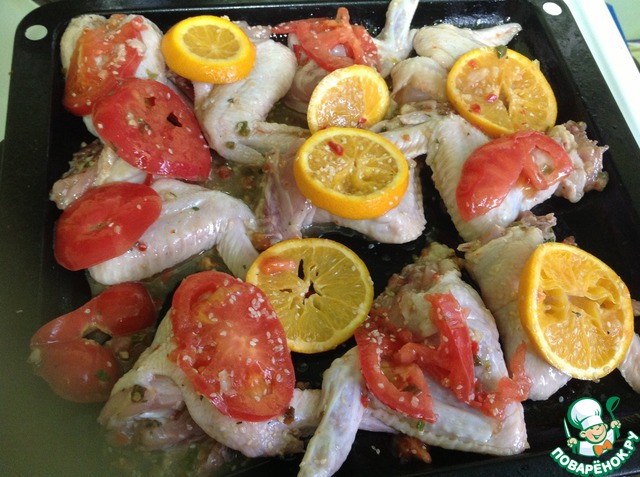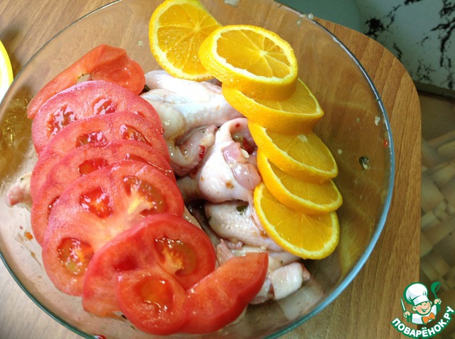 Тонко кружками нарезали помидоры и апельсин, добавили к крыльям, не сильно чуть выжали руками сок с помидор и апельсина, перемешали. Оставляем мариновать на час