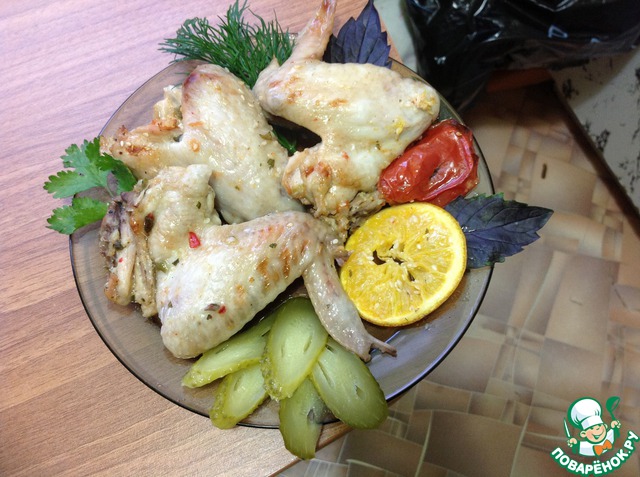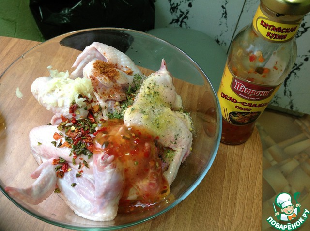 Крылья помыли, положили в посуду для маринования и добавили специи, соус и мелко порубленный чеснок