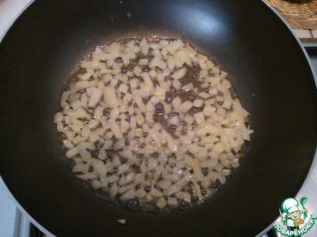Половину средней луковицы мелко нарезаем и жарим на сливочном масле до прозрачности.