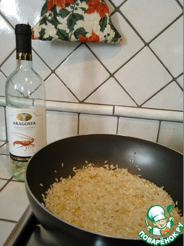 Добавляем рис и обжариваем его с луком в течение одной минуты. Добавить вино и немного подождать, пока оно испарится.