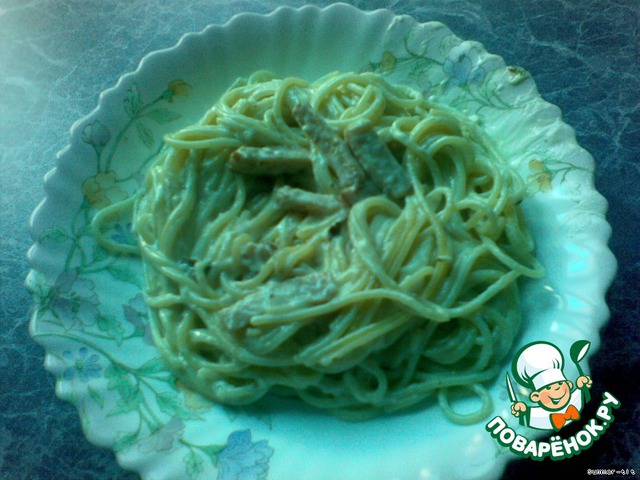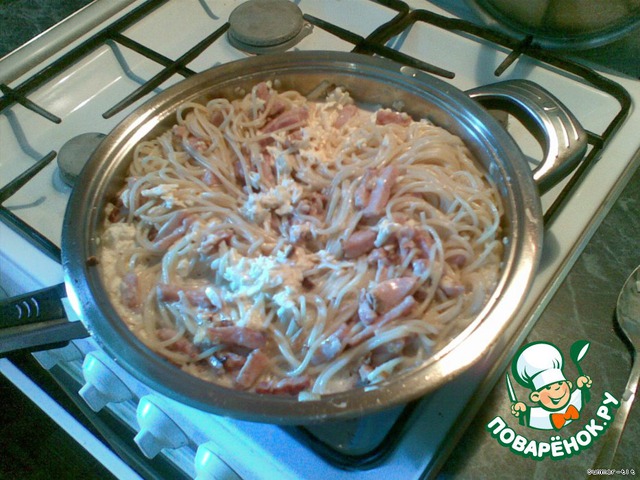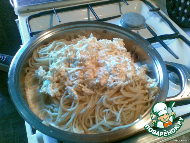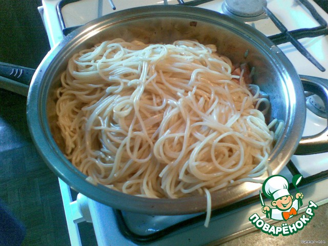 Отваренные до полуготовности спагетти добавить в сковороду...