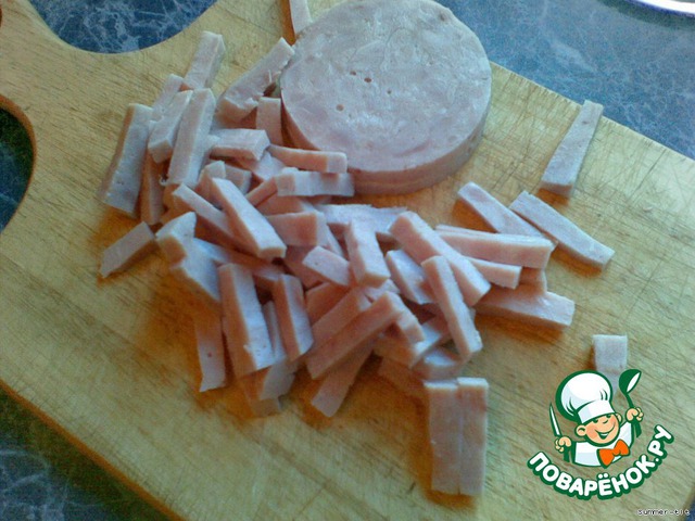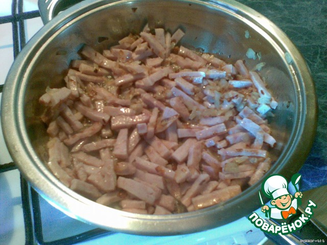 Сковороду с луком и ветчиной опять поставить на огонь.
