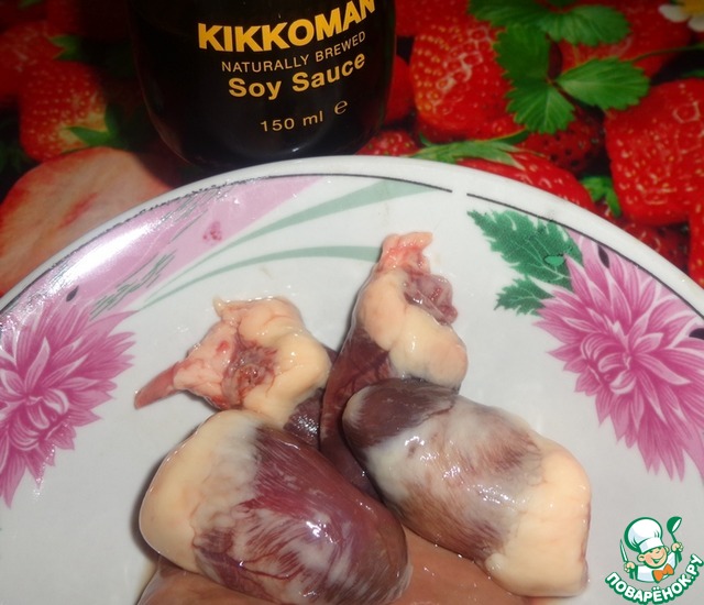 Итак, куриные сердечки сбрызнуть соевым соусом Kikkoman, посыпать перцем душистым и молотым имбирем. Перемешать
