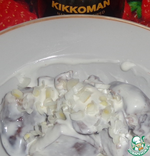 Заливаем сердечки сметаной и перемешиваем. Добавляем измельченный чеснок. Убираем в холодильник на 3-4 часа.