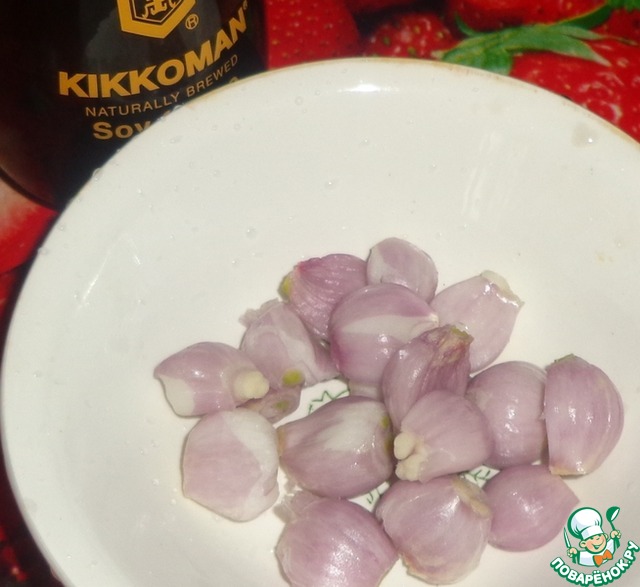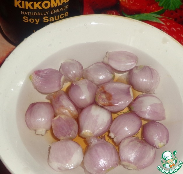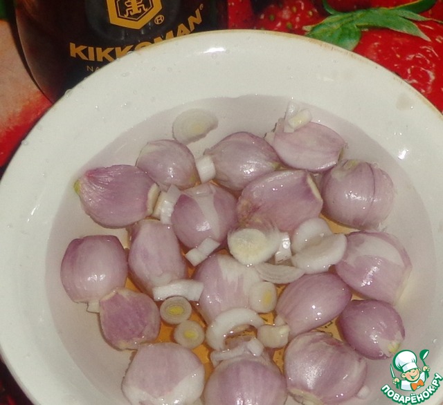 Лук заливаем водой, уксусом и соевым соусом Kikkoman.