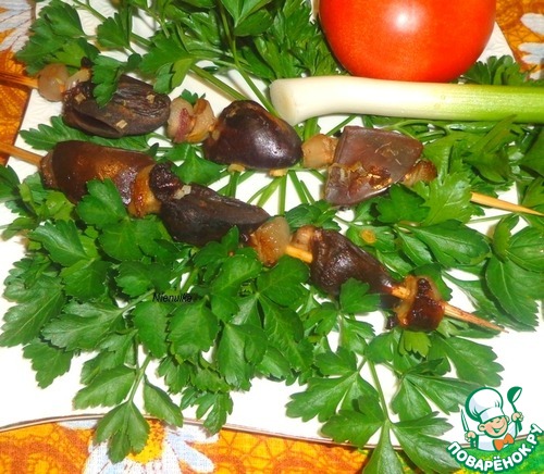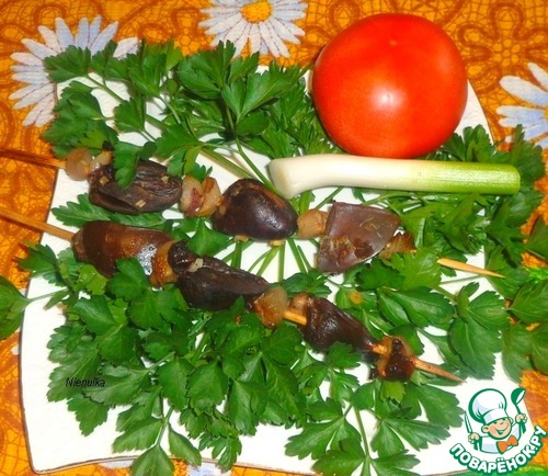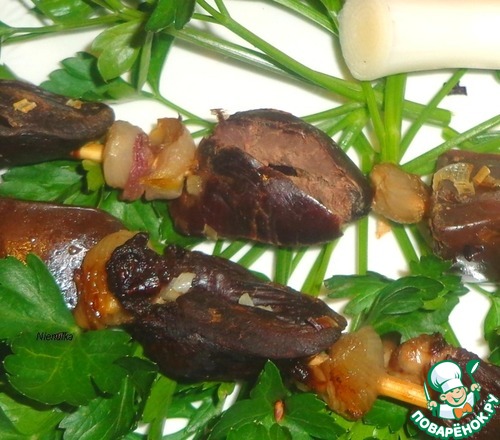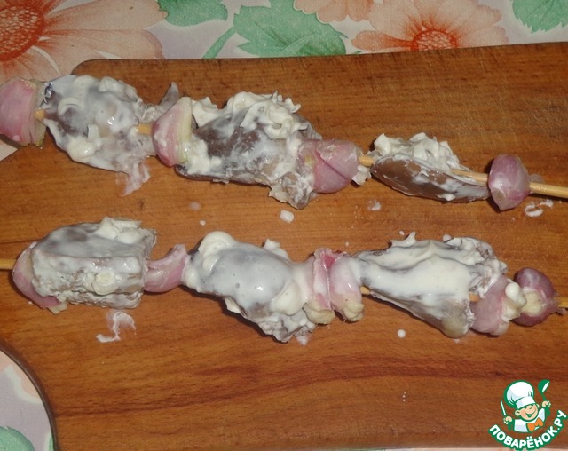 | Ароматный шашлык из куриных сердечек, замаринованный в сметане и специях. Шашлык из куриных сердечек и маринованного лука, запеченный на шпажках. |