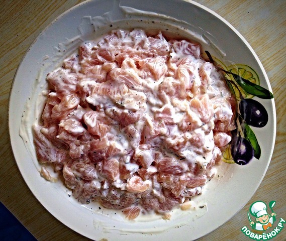 Подготовим индейку. Режем ее очень очень маленькими кубичками, добавляем 3-4 ст. л. сметаны, соль, специи. Оставляем мариноваться минут 30.