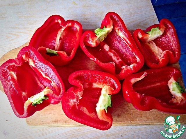 В это время займемся перцем. Его необходимо помыть и разрезать пополам (если у вас перец с хвостиками, то разрезать надо через хвостик, так, что бы он был на каждой половинке). Не срезайте его, с ним блюдо выглядит красивее. Затем удаляем "внутренности" и аккуратно вычищаем половинки-лодочки.
