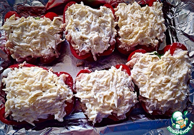Сыр натрем на крупной терке и смешаем с оставшейся сметаной. Эту массу нанесем сверху на перчики. Отправляем в духовку на 40 минут при температуре 220 градусов, до зарумянивания сыра.