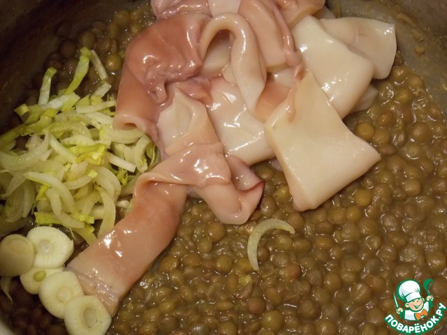 Пока мы все это делали у нас сварилась чечевица. У меня ушла примерно 25-30 мин. Ее посолить. Положить туда резанные чеснок, цикорий, кальмар (сырой) и масло. При помощи блендора сделать пюре.