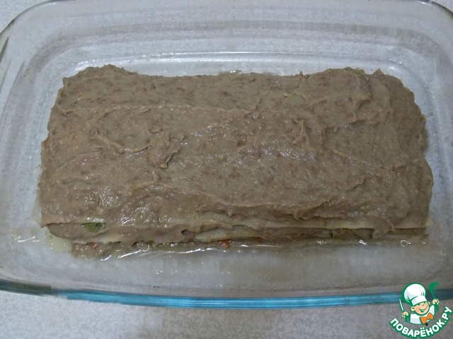 Снова лист, соус, овощи и так до конца. Последним идет лист, который покрываем остатками соуса. Наливаем воды на дно толщиной в 0.5 см. и ставим в духовку на 30 мин. при t= 160. За 5 мин. до готовности, вынуть и полить образовавшимся соком.