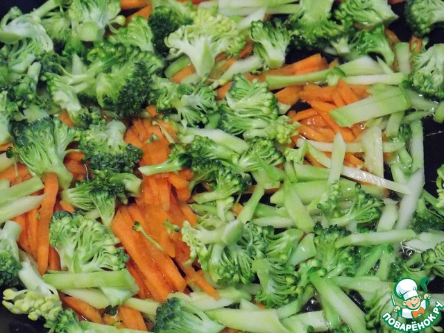Поставить варить чечевицу. Пока она варится займемся остальным. В сковороду налить масло, положить порезанную тонкой соломкой морковь и капусту разобранную на соцветия. Обжарить 2-3 мин.