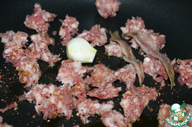 На сковороду наливаем масло, добавляем очищенный чеснок, перчик, анчоусы, колбаску (очистить от оболочки, разделить на мелкие кусочки). Как только кусочки колбаски побелеют, добавляем вино, перемешиваем и даем ему испариться (2 мин).