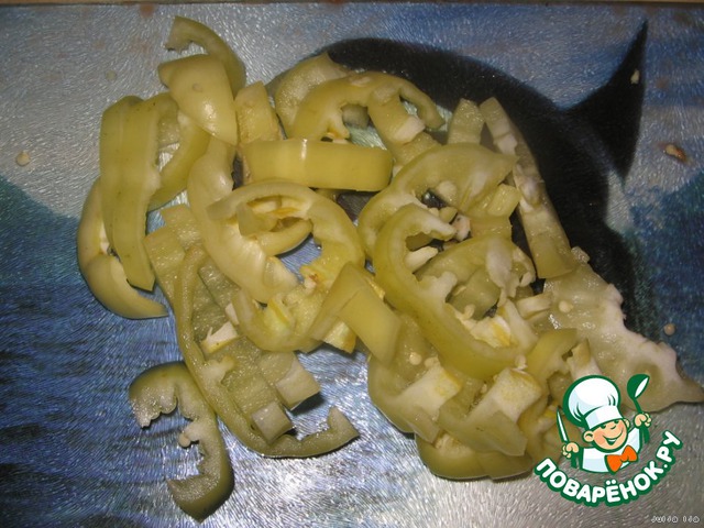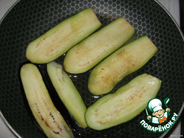Баклажаны нарезаем вдоль, тонкими ломтиками. Кладём их в солёную воду, чтобы не было свойственной баклажанам горечи. Когда полежат немного, обсушиваем их полотенцем и жарим в растительном масле до золотистого состояния.