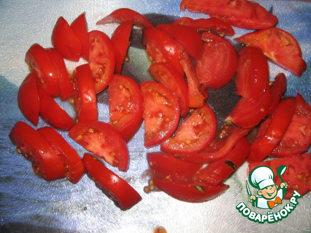Нарезаем ломтиками помидоры. Измельчаем чеснок.