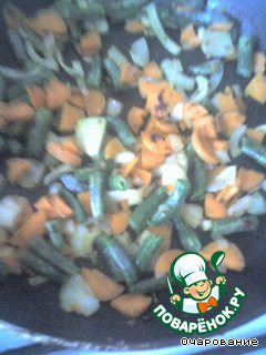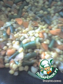 Лук, морковь, фасоль обжарить, добавить, кукурузу и горошек, обжарить, добавить печень, и жарить до готовности, затем добавить отварной рис и залить все сливками, тушить блюдо 15 минут.