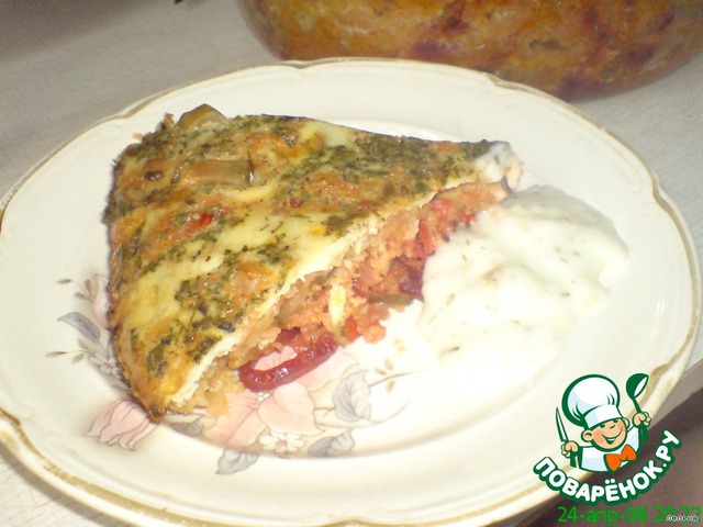 Как только вода впитается (10 - 15мин.), все перемешайте и выложите в форму для запекания, залейте взбитыми яйцами с зеленью и - в духовку, печь при t 200 до золотистой корочки