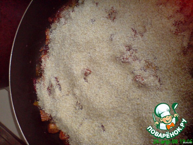 Когда лук начнет становиться прозрачным, сверху насыпать ячневую крупу