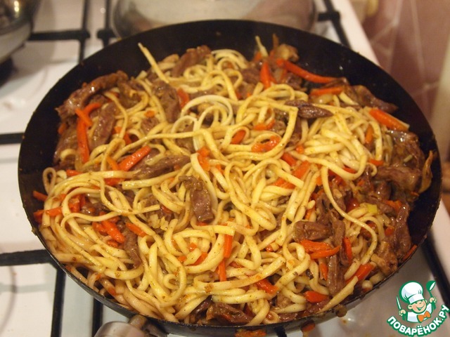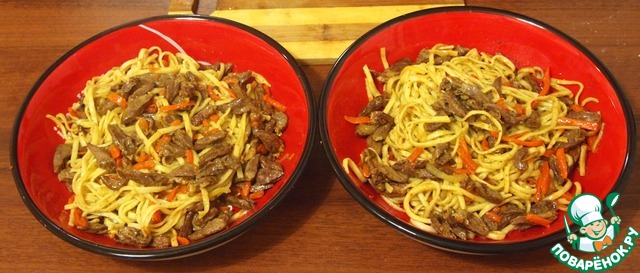 Добавляем лапшу к сердечкам, поливаем соевым соусом и добавляем специи. Тушим еще 2-3 минутки. Проверяем на соленость и влагу. (кто-то любит лапшу по-суше, кто-то нет)