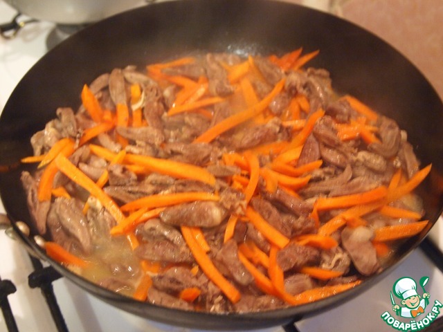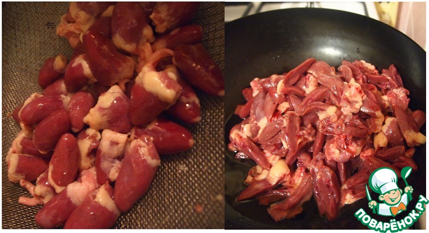 Наши замечательные сердечки промываем и режем на 4 дольки. Затем солим (аккуратно) и обжариваем-тушим, около 15 минут, пока не испарится почти вся жидкость (можно слить немного).