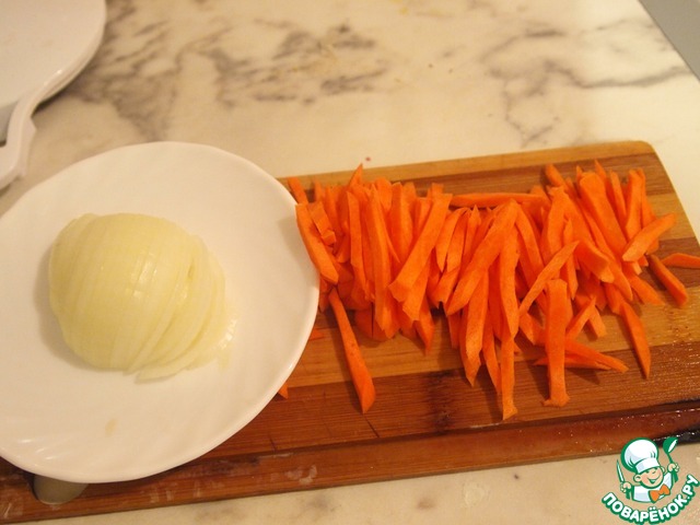 Лук режем полукольцами, морковку - косой соломкой. Для этого можно воспользоваться специальной теркой, если есть.