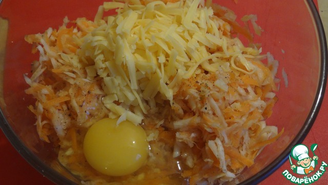 Добавить яйцо, натертый на крупной терке сыр, черный перец. Перемешать