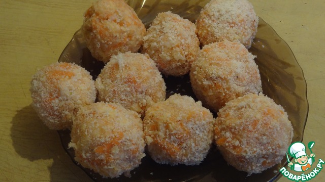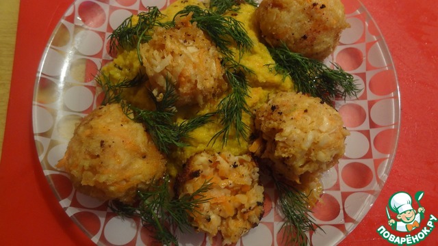 Далее лепим тефтели, лишний сок отжимаем. У меня получилось 9 штук. Обваливаем в панировочных сухарях и потом жарим во фритюре или в духовке. Я попробовала оба варианта, в духовке мне понравилось больше, хотя во фритюре приготовилось быстрее и это не было слишком жирно.
