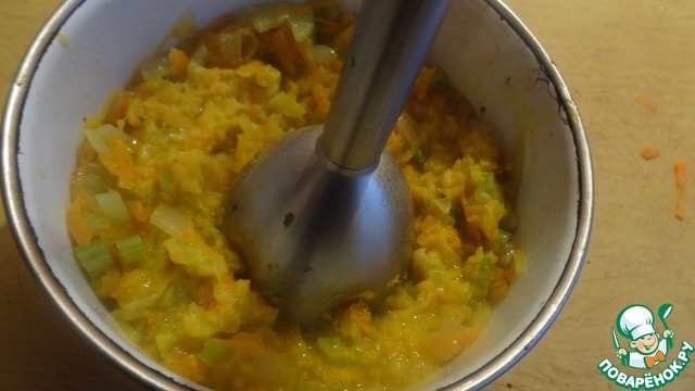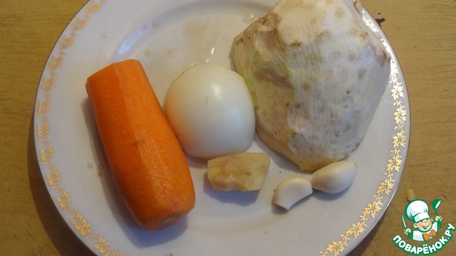 Половину крупной моркови, половину или чуть меньше корня сельдерея, половину луковицы,2-3 зубчика чеснока и маленький кусочек корня имбиря натереть на крупной терке, посолить.