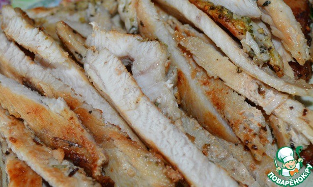 Первым делом нарежем мясо индейки на тонкие пласты. Натрите их любимыми приправами и обжарьте с двух сторон до готовности.