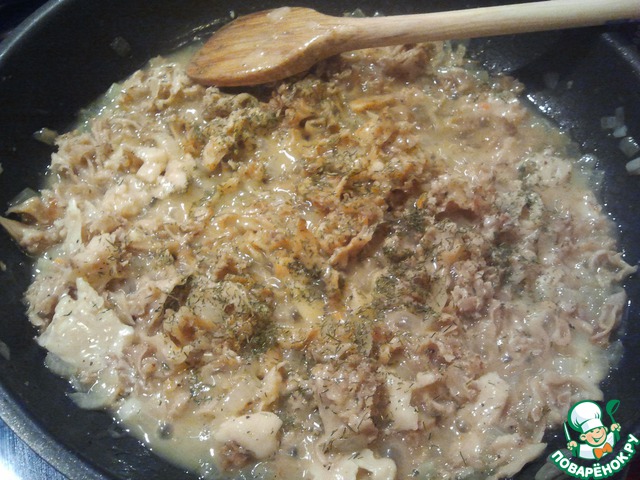 Влить вино. Добавить соль, специи по вкусу и 5 мин. еще потушить. Соус за это время хорошо загустеет.