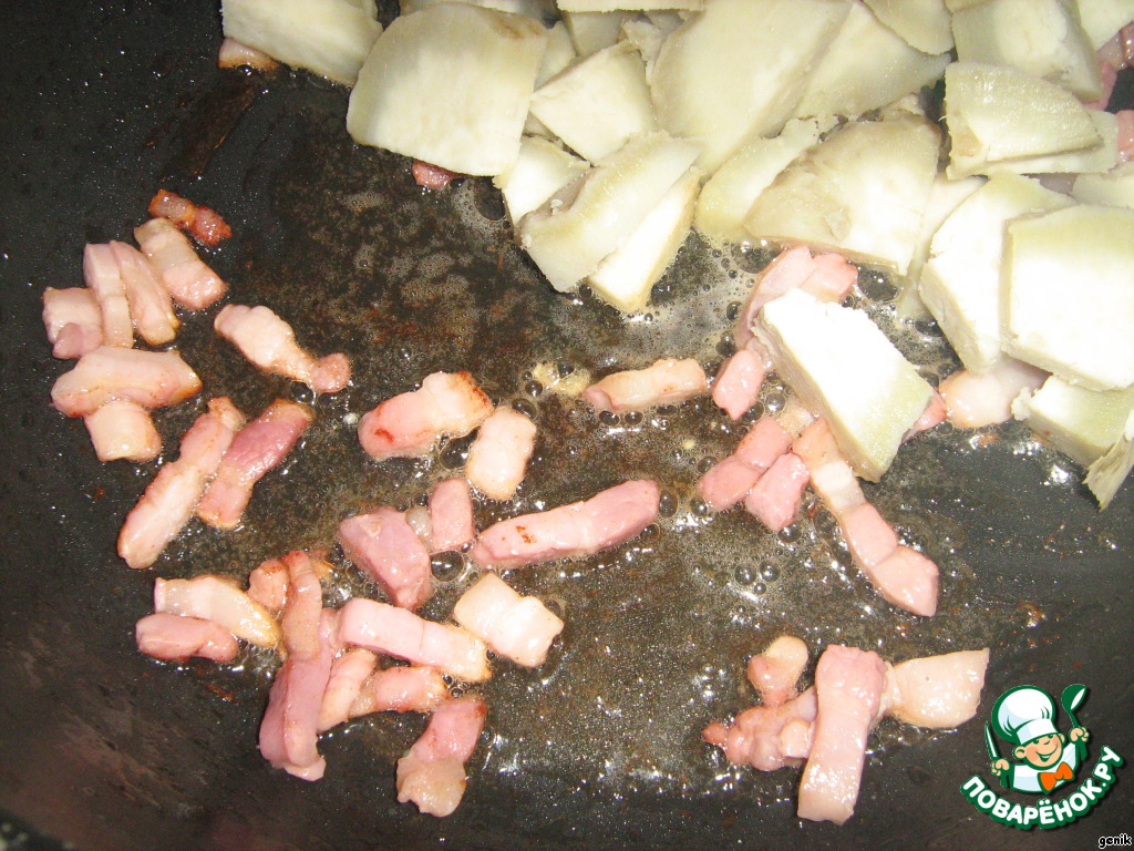 В сливочном масле обжариваем лук и корейку (нарезанные мелкими кубиками) и шалфей.