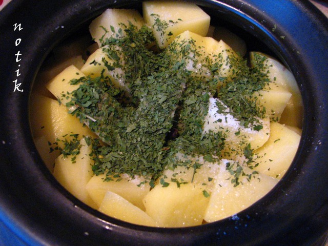 Достать горшок, добавить в него нарезанную морковь и картофель, посыпать зеленью, посолить и добавить воды или бульона; накрыть крышкой и поставить в духовку еще на 30 - 40 мин.