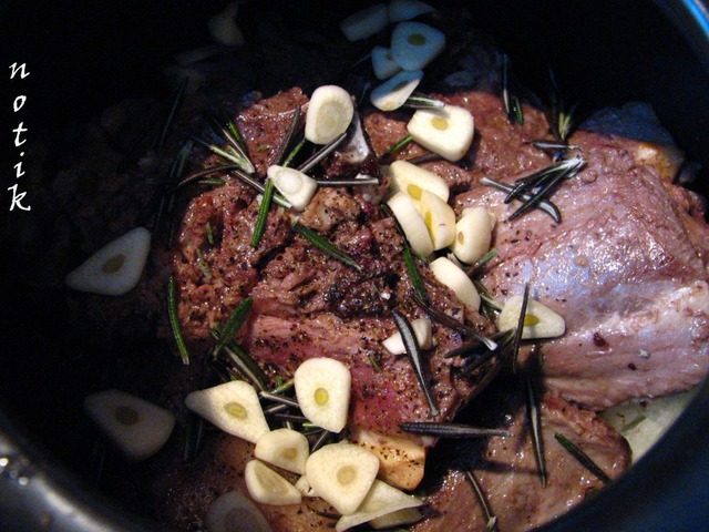 Лук нарезать полукольцами и положить на дно глиняного горшка, на него выложить баранину, добавить розмарин, чеснок, соль и перец, накрыть крышкой и поставить в духовку на 1 час при темперетуре 160 градусов.