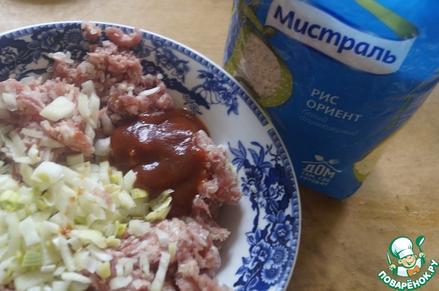 Для тефтелей: в фарш добавить, соль и перец, мелко рубленный лук, тимьян, томатную пасту и рис, хорошо вымешать фарш, так чтобы все ингредиенты соединились между собой.
