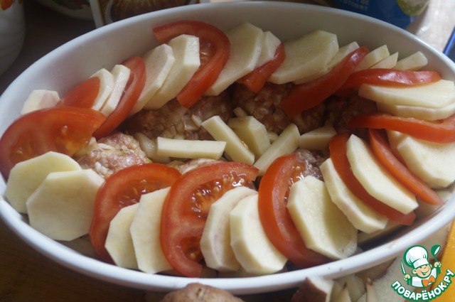 Картофель очистить и сполоснуть, нарезать кружочками не очень тонкими, но и не толстыми. Помидор нарезать тонкими половинками. Выложить поверх тефтелек.