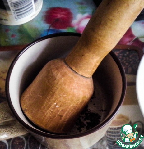 Если у Вас нет ступки для специй, можно использовать кружку и толкушку для картофеля. Хорошо разминаем перец и можжевельник. Добавляем тмин и розмарин, размельчая руками, словно протирая сквозь пальцы. Растираем все вместе толкушкой. Добавляем 0.5ч. л прованскийх трав, добавляем 2 ч. л морской соли и сюда же добавляем 2 ч. л растительного масла.
