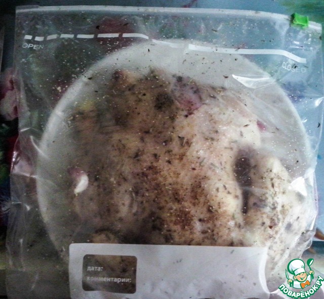 Моем курицу, делаем с ней все необходимые операции. Обычно я смолю курицу или можно обжечь ее горелкой, такой, как продают в строительных магазинах. Натираем нашим маринадом курицу. Чеснок, половину головки не чистим, просто режем любыми ломтиками, немного кладем внутрь курицы, остальное, просто в пакет. Курицу заворачиваем в пакет/пищевую пленку и тд. Обычно я для таких случаев использую пакет на застежке. Кладем в холодильник на час. Что бы мясо пропиталось.