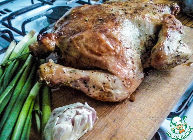 После того, как мы достали курицу, подготовим духовку. До 180 градусов. Можно застелить дно фольгой, можно нет ( если использовать фольгу, есть риск что курица будет прилипать). Поверх курицы кладем сливочное масло. Чеснок, которые был в пакете разбрасываем по форме и так же кладем кусочки сливочного масла. Отправляем в духовку, на 40-50 минут. В процессе приготовления, курицу я переворачивала один раз
