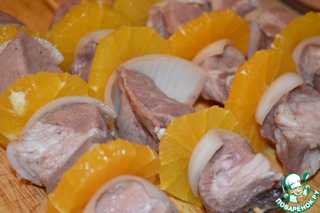 Свинину, лук и апельсин на низать поочередно на шпажки.