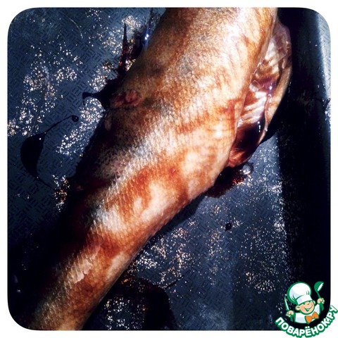 Судака смазываем внутри и снаружи бальзамическим соусом, либо медом с лимонным соком и солью. Оставляем пока делаем лук.