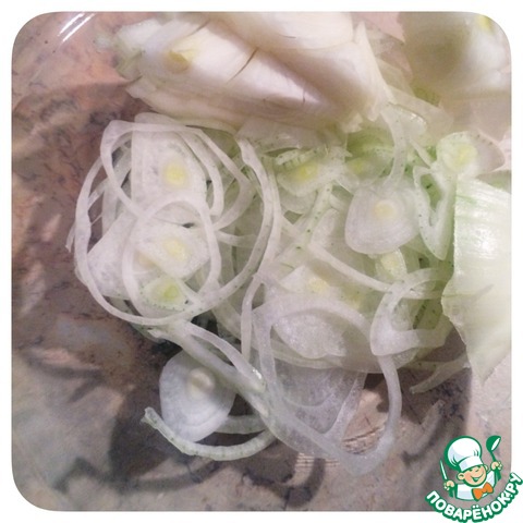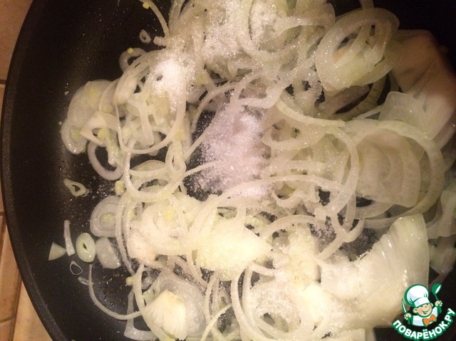 В сковородку наливаем пару столовых ложек оливкового масла и сразу выкладываем лук. Не даем ему жариться, помешиваем пока не пустит сок. Добавляем три ч/л сахара, мешаем, нужно чтобы сахар растворился и лук будет тушиться в этом сиропе до мягкости.