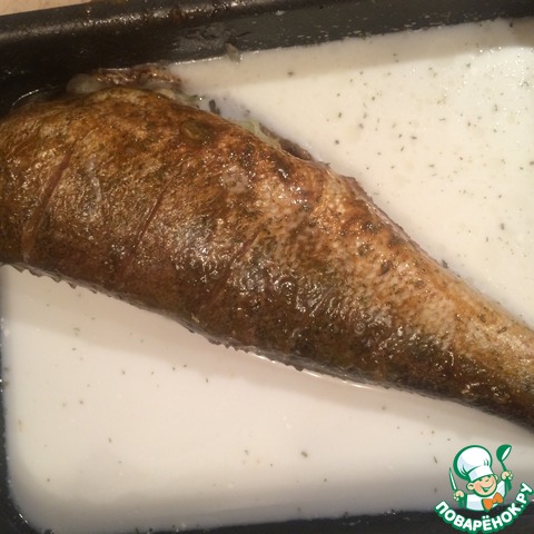Сметану смешиваем с водой и солью по вкусу. Заливаем судака и ставим в духовку. Я поставила в холодную и выставила 170*. Два раза в процессе судака нужно перевернуть и полить соусом, в котором он у нас запекается.