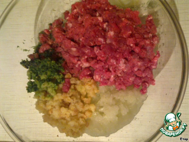 Для котлет готовим фарш: мясо, 1 большую луковицу, половину айвы, чуть зелени пропускаем через мясорубку.