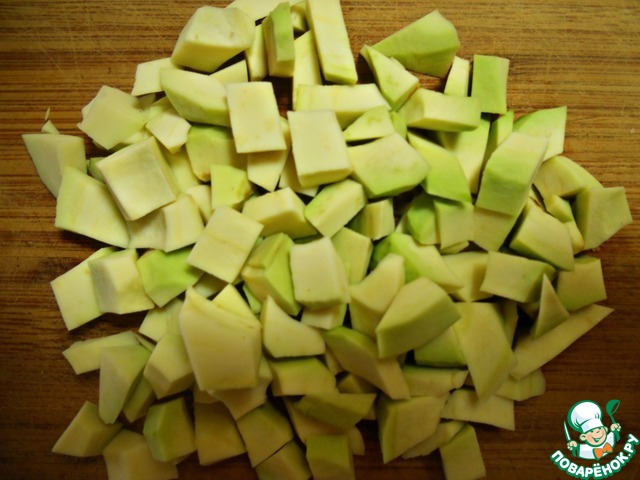 Авокадо очистите от жесткой кожуры и удалите косточку, нарежьте небольшими кубиками.