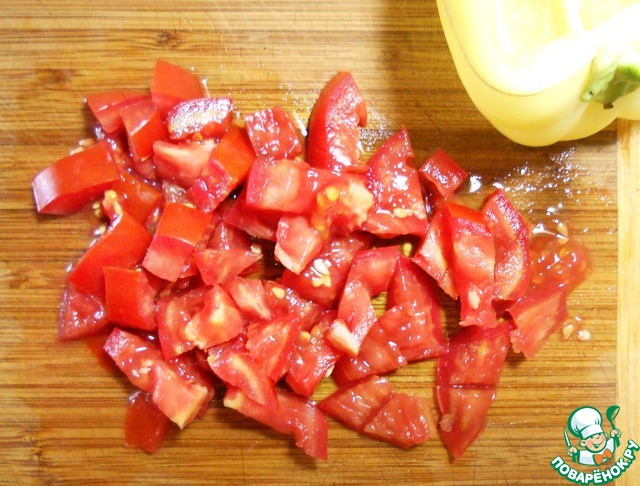 Болгарские перцы разрежьте вдоль (срезать нужно небольшую крышечку), очистите от семян и перегородок. А срезанные макушки нарежьте кубиками.